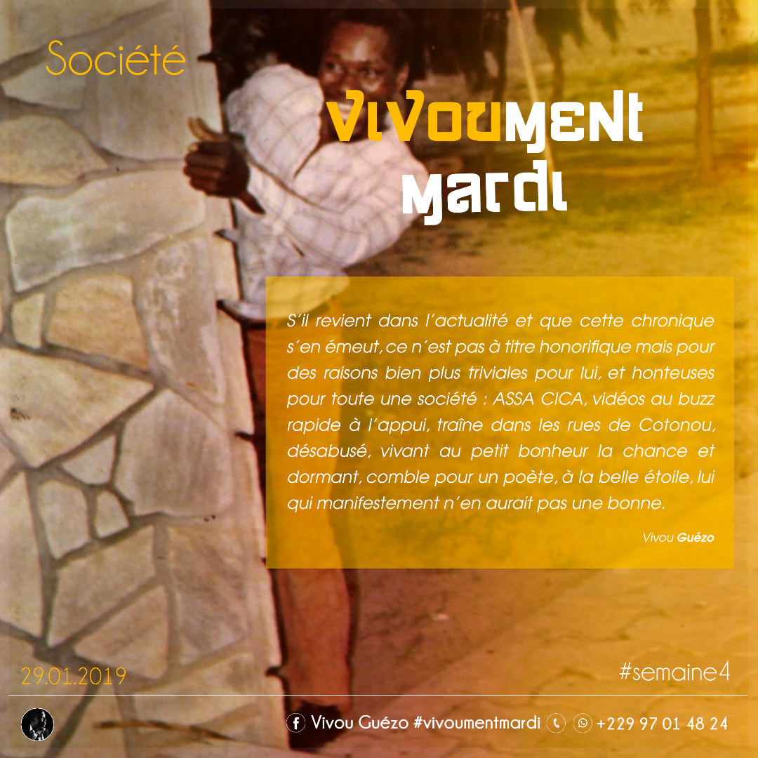 Agadja Michel KPODAN, voilà bien des prénoms et nom qui n’évoqueront pas grand-chose ou si peu au Béninois lambda. Et pourtant, ce sont à l’état civil ceux désignant l’une des icônes de l’histoire de la musique nationale : ASSA CICA. Je vous l’avais bien dit, que vous reconnaîtriez. S’il revient dans l’actualité et que cette chronique s’en émeut, ce n’est pas à titre honorifique mais pour des raisons bien plus triviales pour lui, et honteuses pour toute une société : ASSA CICA, vidéos au buzz rapide à l’appui, traîne dans les rues de Cotonou, désabusé, vivant au-petit-bonheur-la-chance et dormant, comble pour un poète, à la belle étoile, lui qui manifestement n’en aurait pas une bonne.