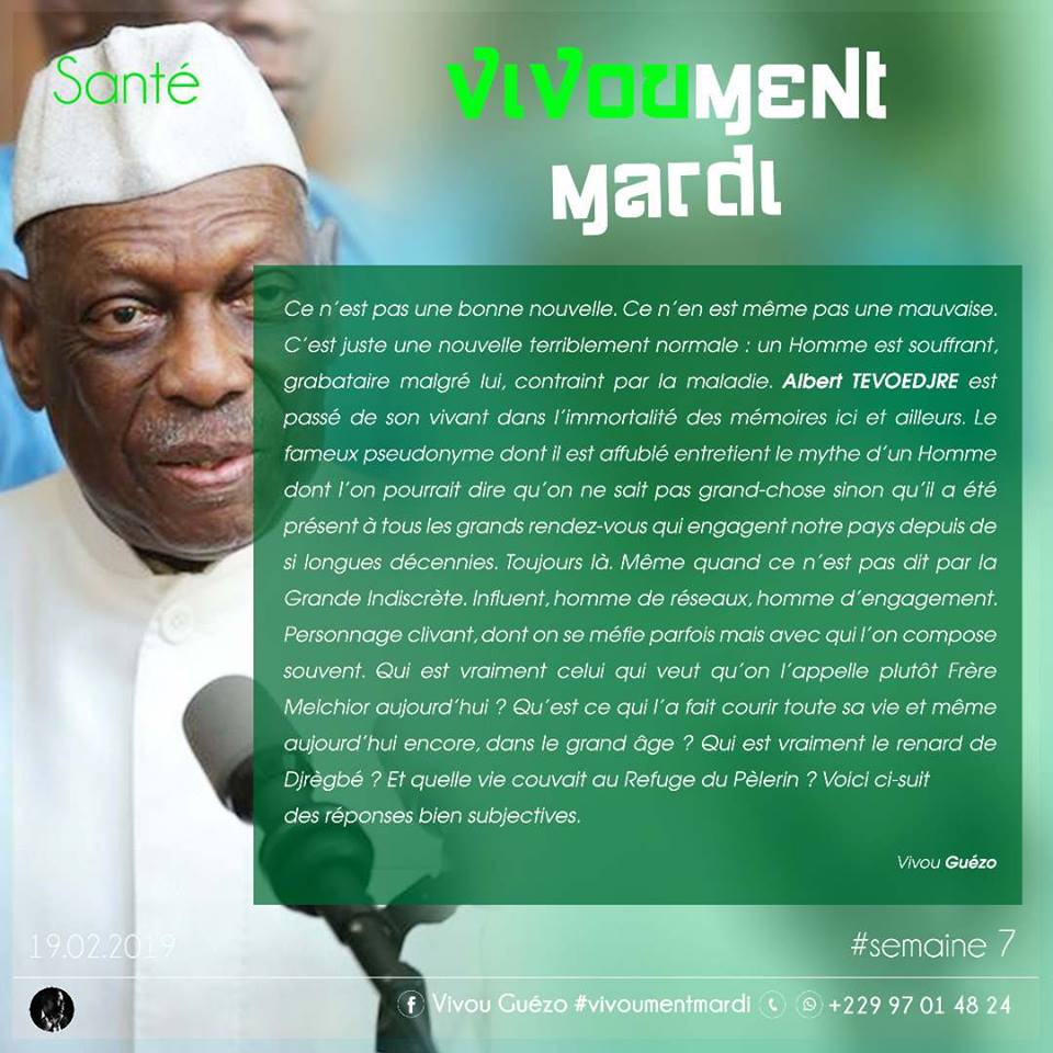 Ce n’est pas une bonne nouvelle. Ce n’en est même pas une mauvaise. C’est juste une nouvelle terriblement normale : un Homme est souffrant, grabataire malgré lui, contraint par la maladie. Albert TEVOEDJRE est passé de son vivant dans l’immortalité des mémoires ici et ailleurs. Le fameux pseudonyme dont il est affublé entretient le mythe d’un Homme dont l’on pourrait dire qu’on ne sait pas grand-chose sinon qu’il a été présent à tous les grands rendez-vous qui engagent notre pays depuis de si longues décennies. Toujours là. Même quand ce n’est pas dit par la Grande Indiscrète. Influent, homme de réseaux, homme d’engagement. Personnage clivant, dont on se méfie parfois mais avec qui l’on compose souvent. Qui est vraiment celui qui veut qu’on l’appelle plutôt Frère Melchior aujourd’hui ? Qu’est ce qui l’a fait courir toute sa vie et même aujourd’hui encore, dans le grand âge ? Qui est vraiment le renard de Djrègbé ? Et quelle vie couvait au Refuge du Pèlerin ? Voici ci-suit des réponses bien subjectives.